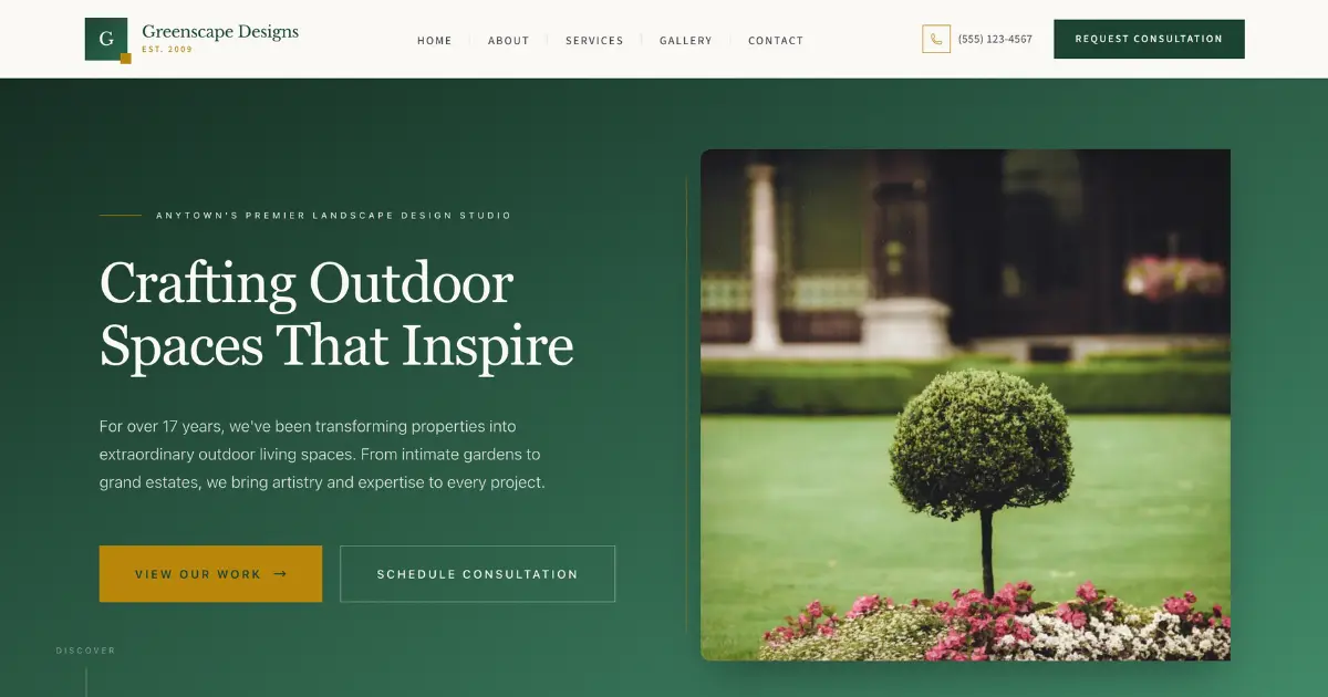 Professional landscaping company website featuring service showcases, project galleries, and contact forms.
